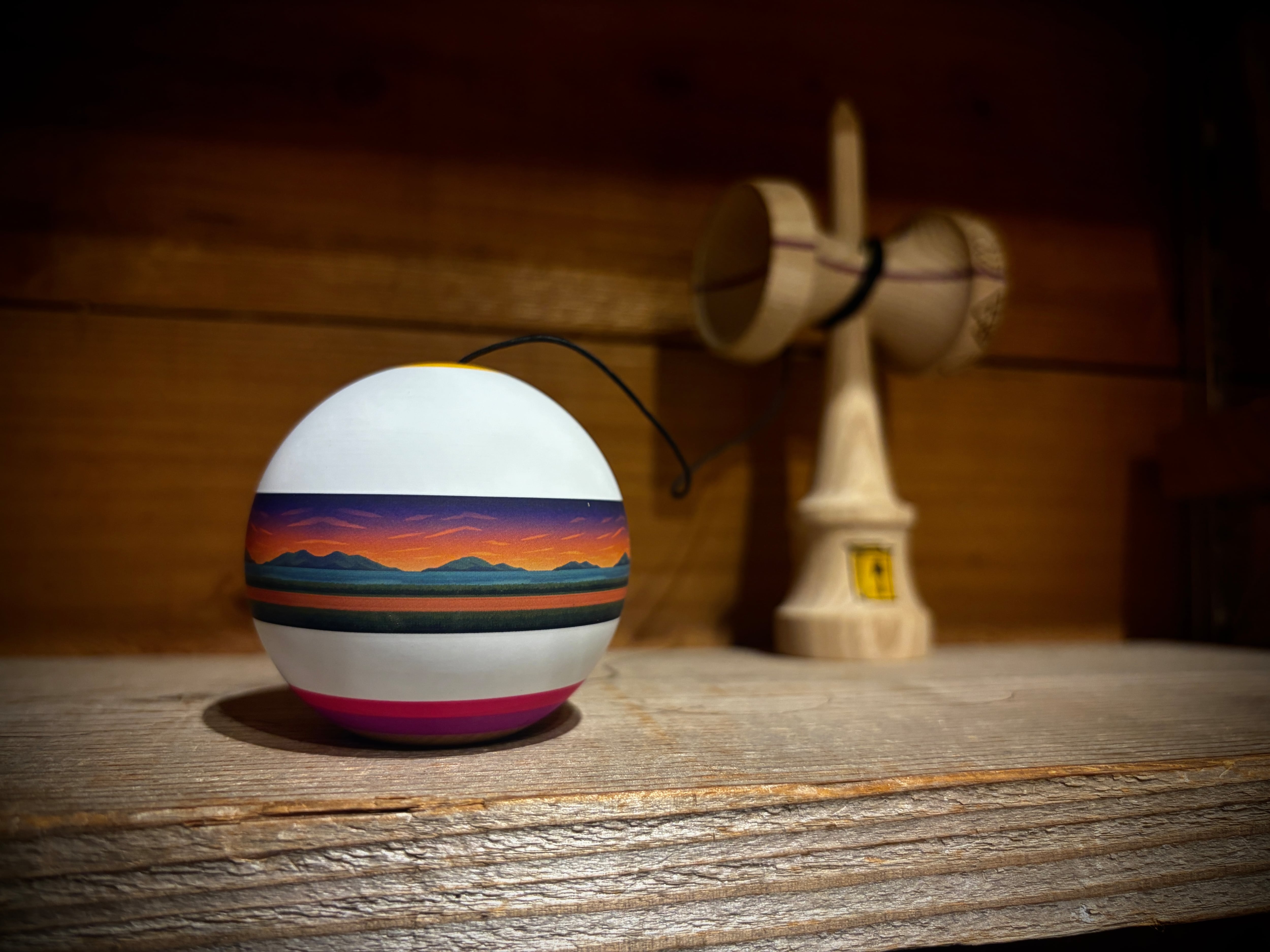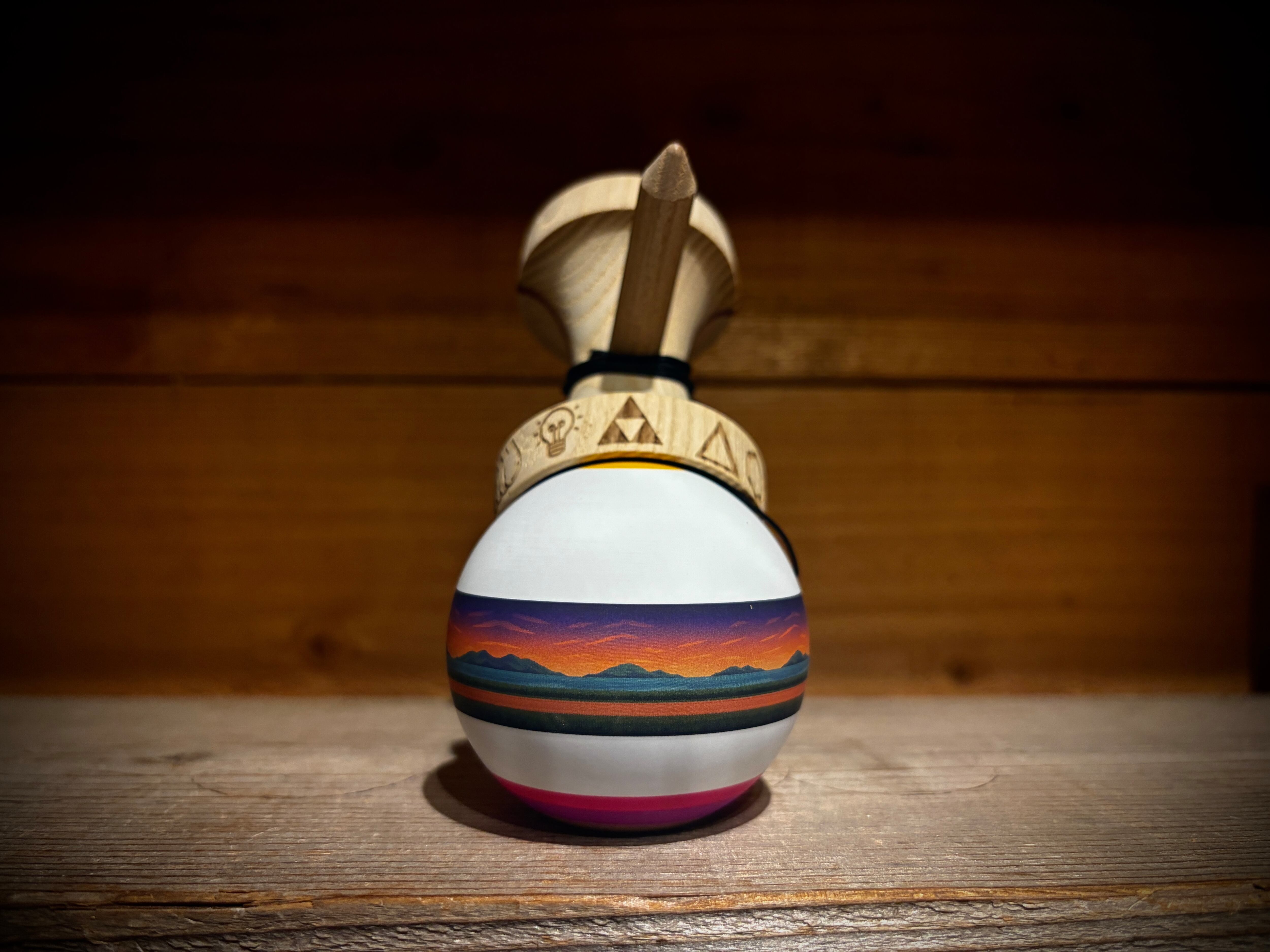 Cereal オーナーJon mod 彼は「何かを成し遂げることよりも、その過程(旅)を楽しむことの方が、ある意味ではもっと大切だ」と考えています。 山のデザインなどは その“旅の景色”を表しています 純粋にけん玉を楽しむ彼の姿は多くの共感を得てます彼らしい美しいけん玉ですね! Ken Wood Ash w/ 2mm purpleheart splice Tama Wood Beech Paint Cloud+